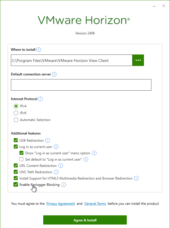 - Click Agree & Install. Or you can click Customize Installation. Horizon Client 2203 and newer has an option to Enable Keylogger Blocking, but only in Custom installation. Or Horizon Client 2309 and later let you enable Keylogger Blocking in the Settings interface.